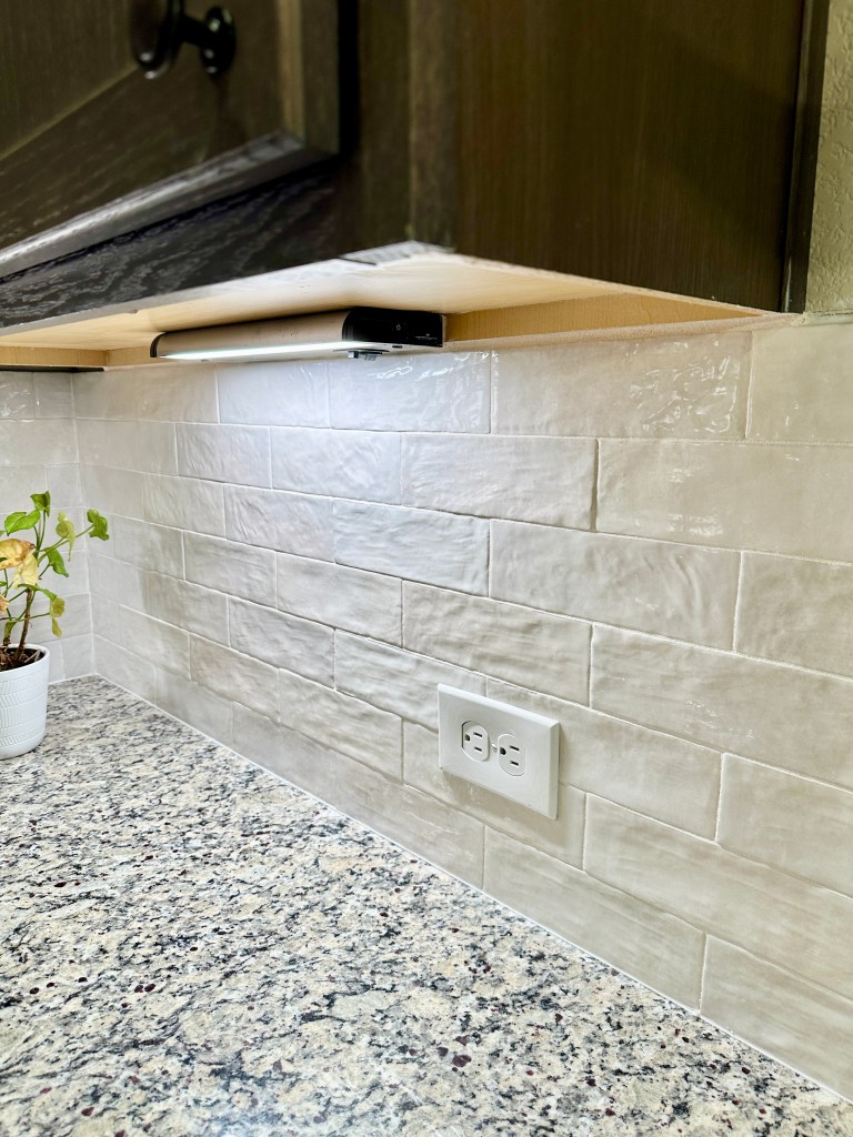 I decided to skip the peel-and-stick route and go for a more permanent, professional look. I hired a handyman to install a classic ceramic subway tile using mastic and grout. Rather than going with a stark white tile, I specifically chose a creamy neutral with a bit of texture—something that wouldn’t compete with the granite countertops or dark cabinetry, but would instead complement them. A bright white tile would have felt too harsh and popped too much against the warm tones in the space.
