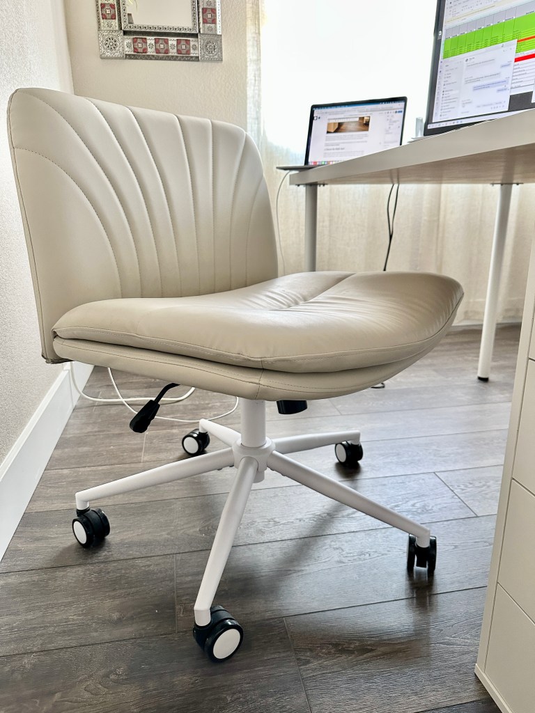 Your chair is arguably the most important piece of home office furniture. Prolonged sitting in the wrong chair can lead to back and neck pain. Choose one with ergonomic support and adjustable features—or, if you’re like me and enjoy sitting cross-legged from time to time, consider a chair with a wider seat and flexible design that allows for that. If you can, test it out before buying—or look for one with great reviews.