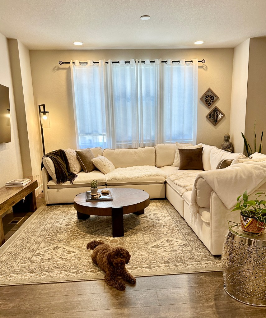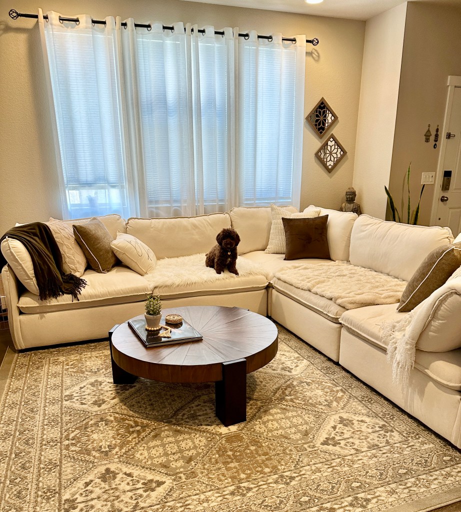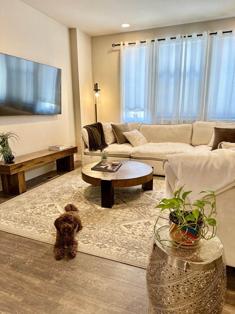 I started with a neutral, textured area rug that instantly grounded the space. It’s soft underfoot, adds visual warmth, and defines the seating area beautifully.
