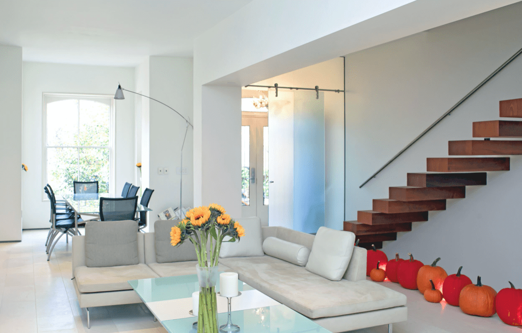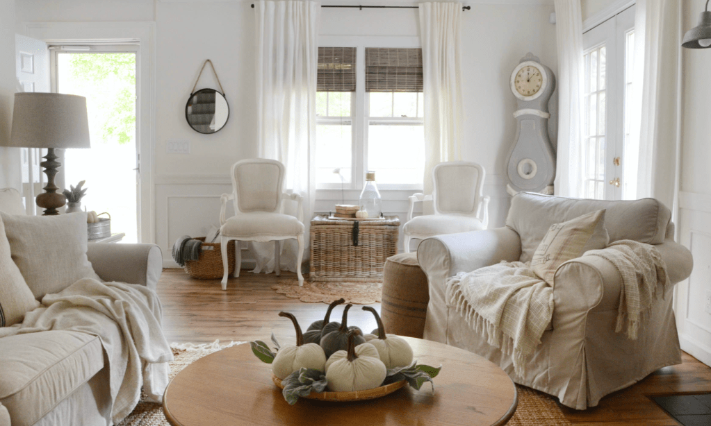 For the living room, continue the theme by adding small pumpkins to shelves, side tables, or even a console table near the entryway.